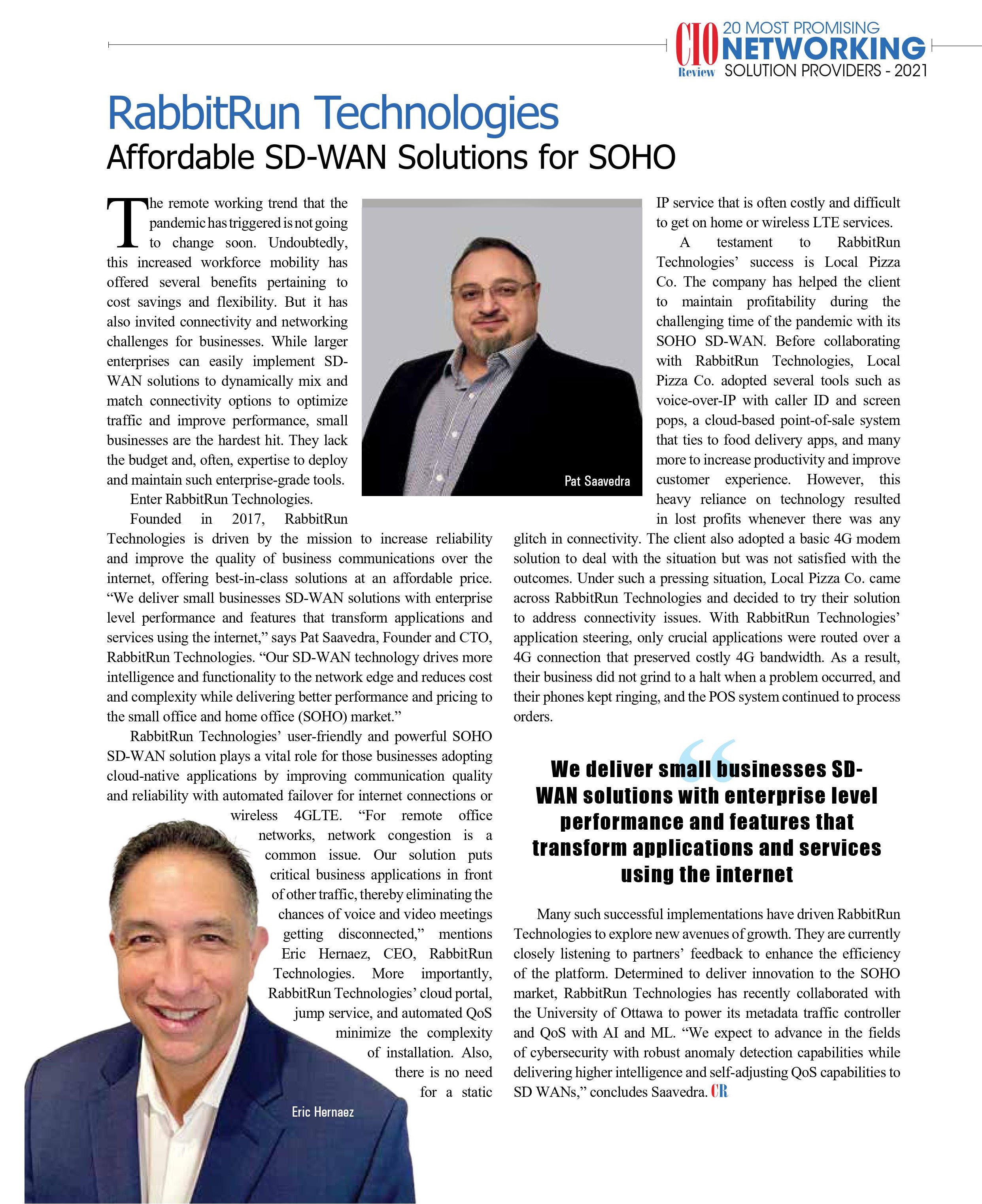 RabbitRun Technologies Recognized as Most Promising Networking Solution Providers 2021 – CIOReview