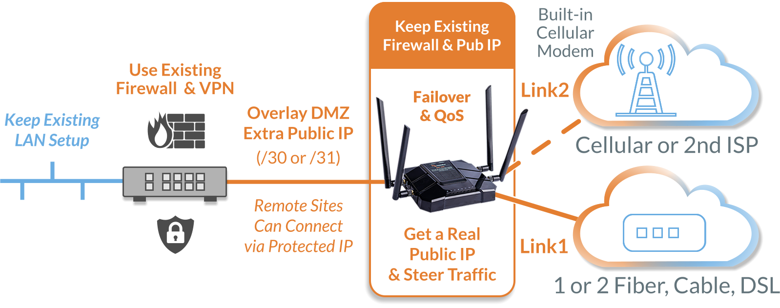 ✓ Use your current network setup without changing your firewall’s ISP-assigned public IP.