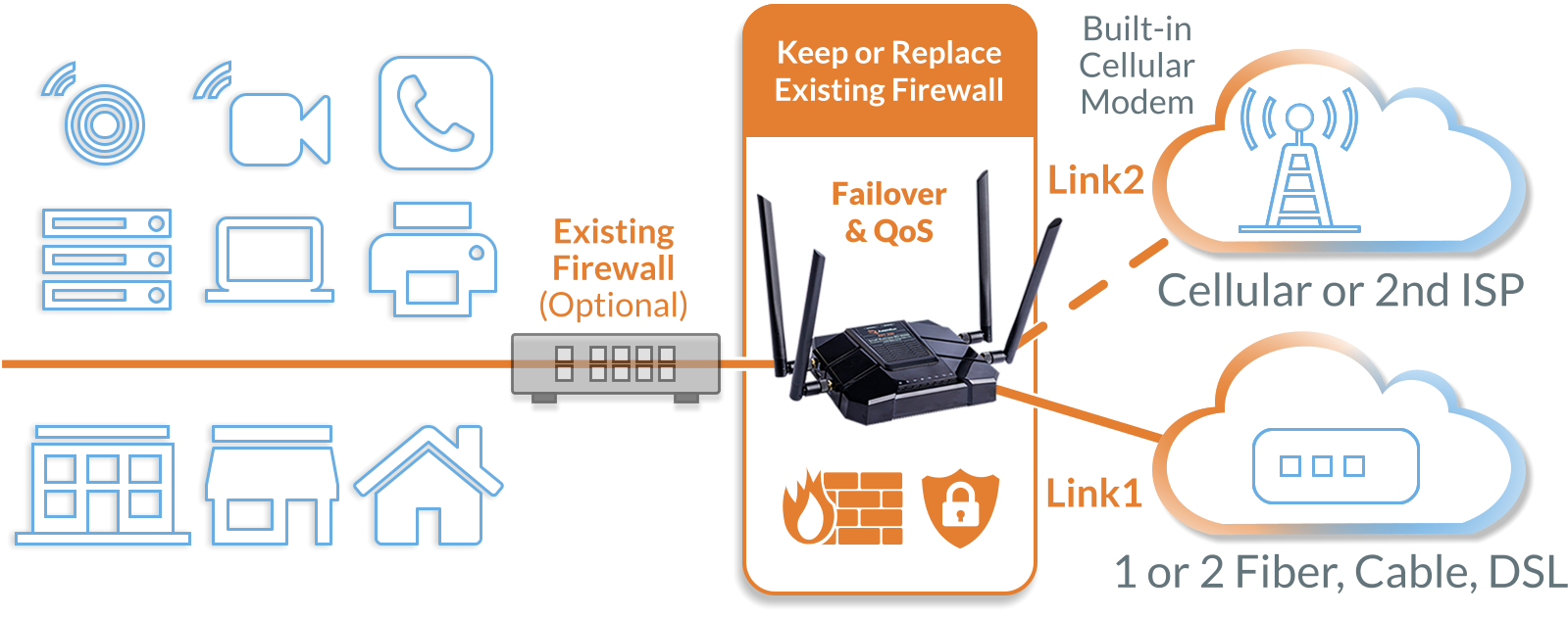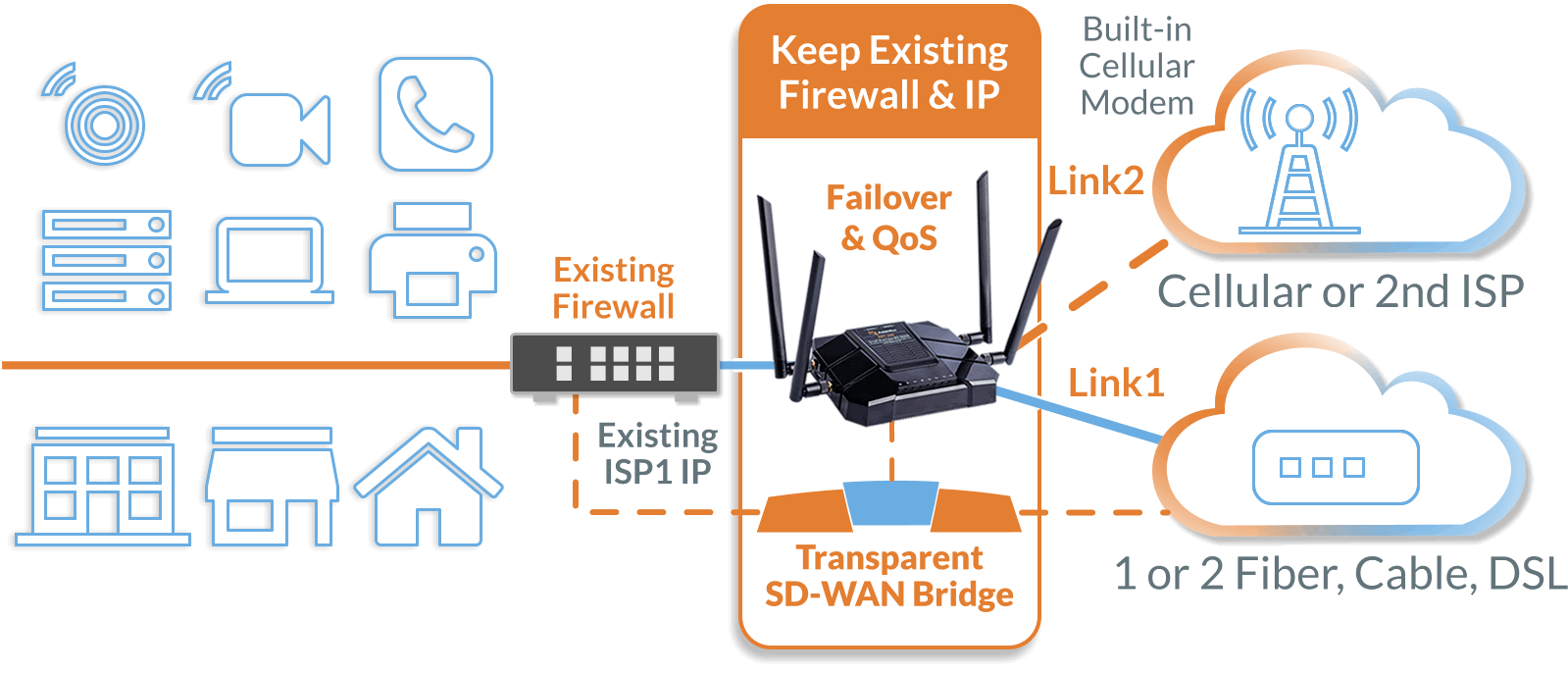 ✓ Actively monitors and intercepts Voice, Point-of-Sale, and other mission-critical traffic, providing automatic failover to a secondary ISP or RabbitRun’s Multi-Carrier Cellular service.